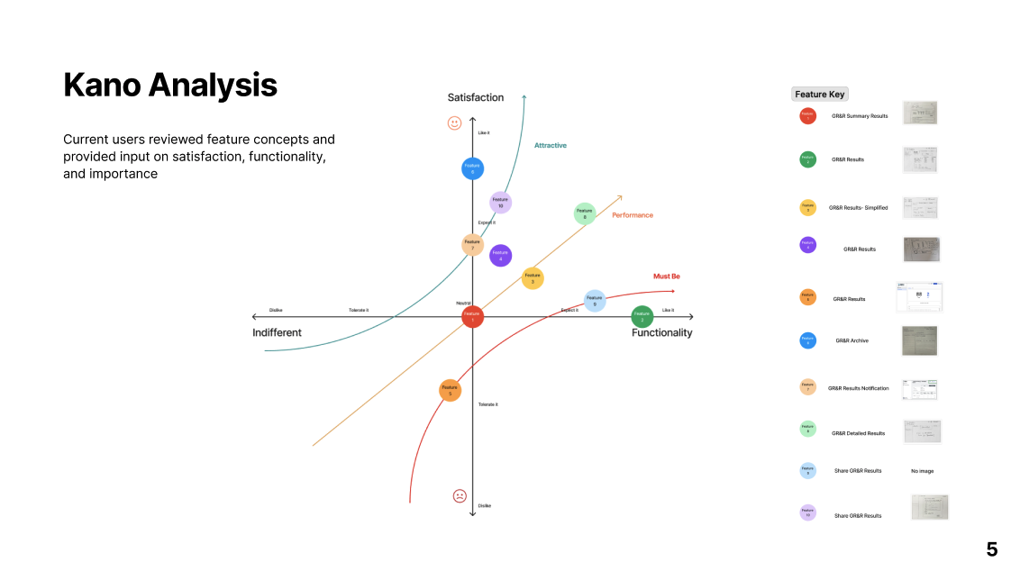 The Kano Survey was sent to current users in the platform. They reviewed our feature concepts and provided input on satisfaction, functionality, and importance.