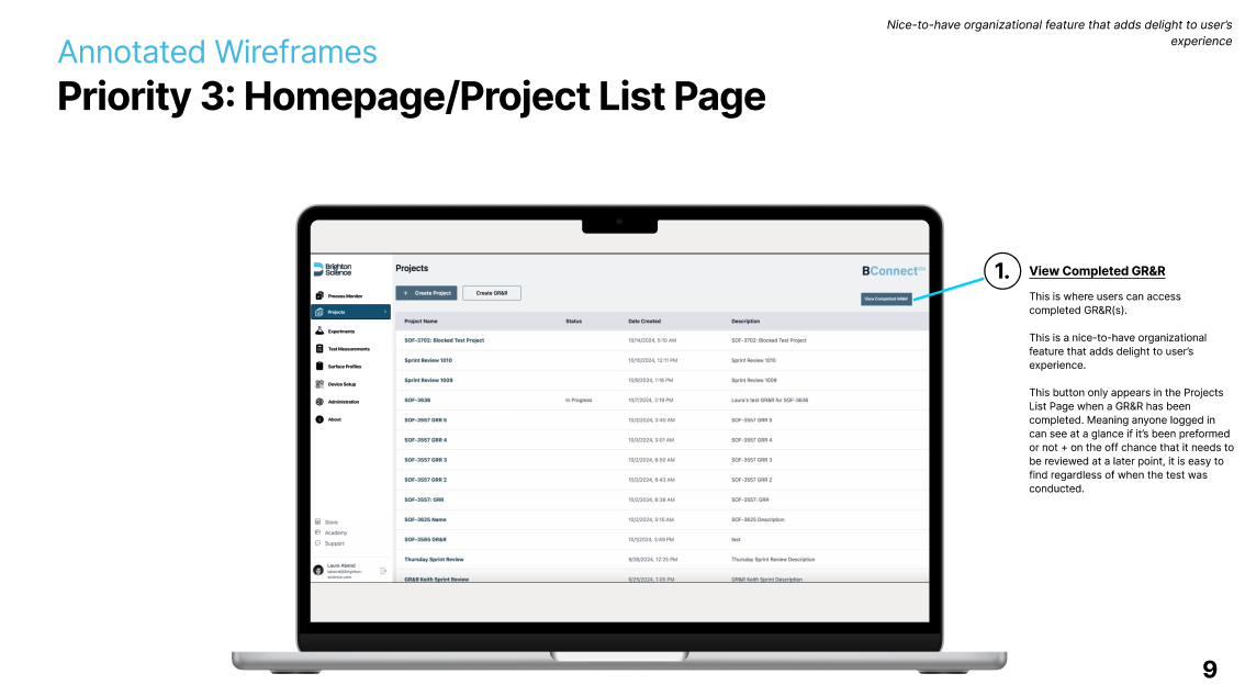 The final wireframe was a simple add with a big impact: creating peace of mind in the user experience. I added a button to the homepage that clicks through to GR&R results, accomplishing two things: