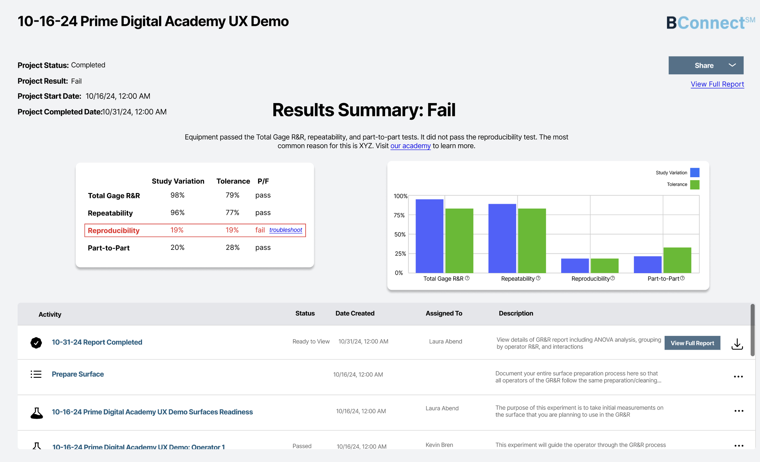 Currently, the results of each of the 3 individual experiments are viewable in their own separate results page, but there is no view that shows all results together and aggregated in the same view. This means that primary users have to create an excel spreadsheet and manually input hundreds of data points in order to evaluate whether or not their SA has passed the GR&R test. Manually creating an aggregated report can take days, if not weeks to complete.