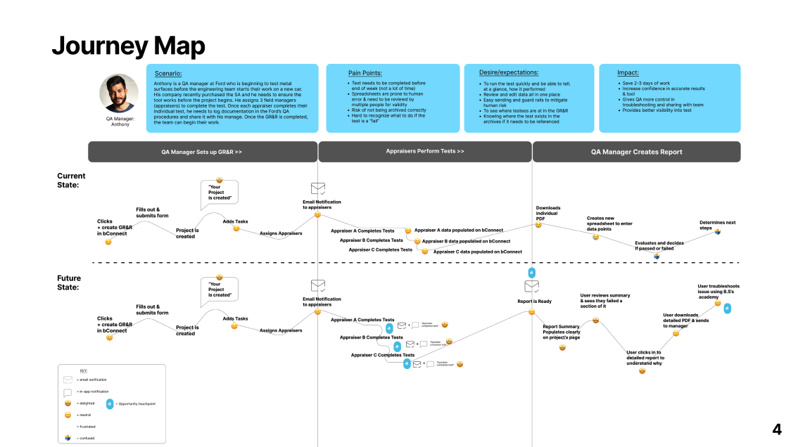I created a journey map that highlights the current and future state of the GR&R workflow, highlighting pain points and happy points along the way.